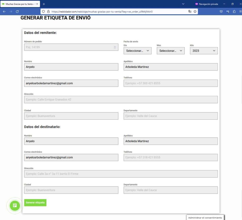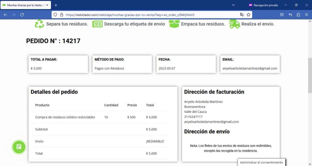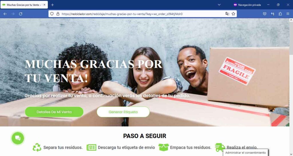 Te redirigirá a nuestra pagina de gracias en la que puedes ver los detalle de tu pedido, generar y descargar la etiqueta para tu envió.