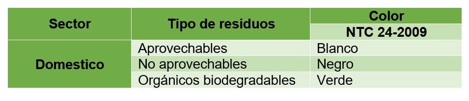 A nivel nacional el manejo de colores para separar los residuos en Colombia lo define la norma técnica colombiana 24. (En este documento expresa una clasificación general la cual puede ser utilizada).