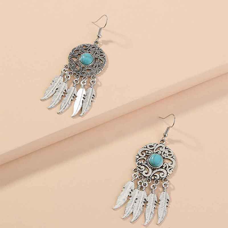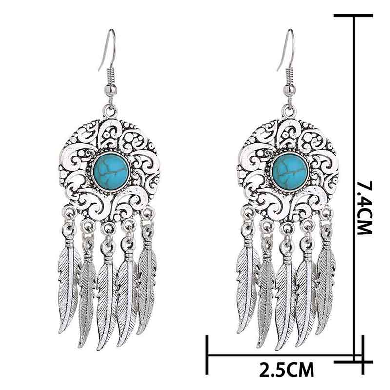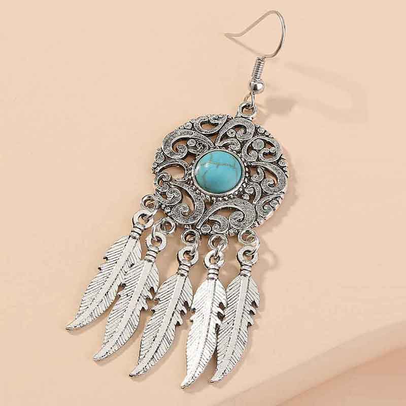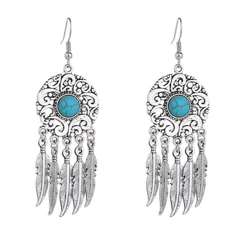 Aretes vintage atrapasueños con grabado de plumas y turquesa para mujer